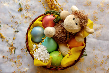 Easter lamb with colored pearly eggs in basket. Shallow depth of field