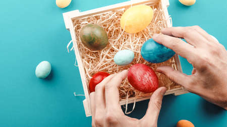 Happy Easter. Easter colorful eggs and letters on a mint wooden background. Greeting card, horizontal banner with copy space, top view. Creative Easter composition in pastel colors, flat lay. Handmade