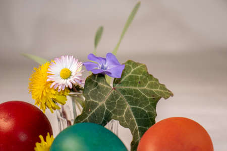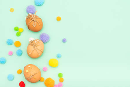 Decorated Easter eggs with small white flowers on green background. Decorated Christian Easter eggs with colorful balls on green background. copy space.