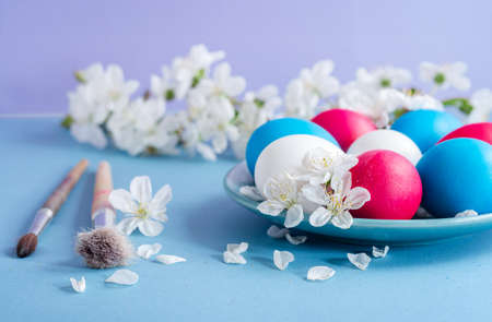 Colored eggs on a blue background and a sprig of willow, the concept of the Easter holiday. Template for postcards and congratulations.