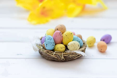 happy easter, colorful easter eggs in a nest on a white wooden background.