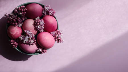 A gray bowl with bright pink Easter eggs and lilac flowers on a purple background. easter decor. selective focus.