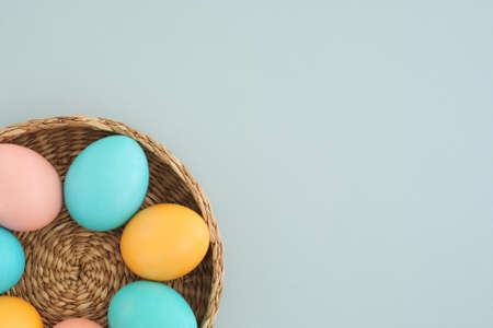 Easter eggs painted in pastel colors in a wicker basket on a blue background. Minimalistic Easter background. Easter concept. Top view, flat lay, copy space