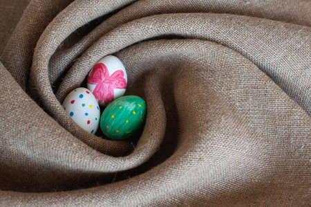 Easter composition: a bouquet of willow twigs and painted eggs on a linen napkin