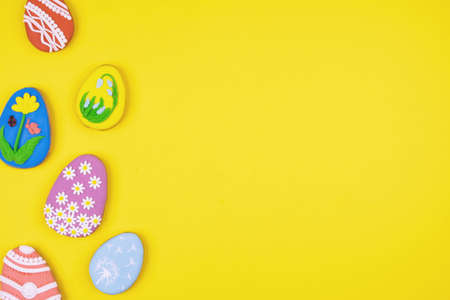 Easter cookies on a bright yellow background. Easter background with space for text. Handmade gingerbread with multicolored mastic. Flatlay