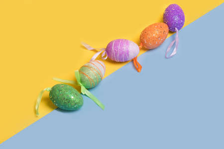 Creative Easter layout made of colorful eggs arranged diagonally on illuminating yellow and blue background. Minimal easter concept. Easter card with copy space for text.