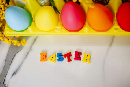 Letters Easter Background Colored Eggs. Postcard. Family Tradition Concept. Selective focus