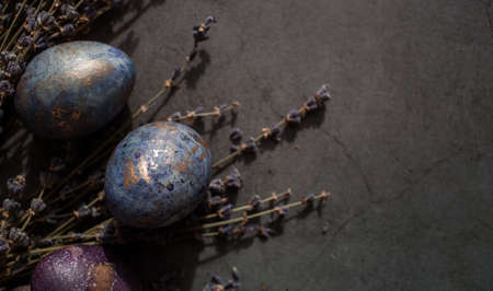 Purple, blue and golden eggs with lavender on a dark background. The purple hue trend of 2022 is very relevant. Natural dye karkade tea. top view. Easter card with a copy of the place for the text.