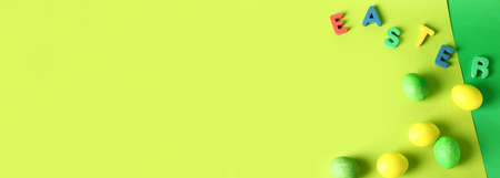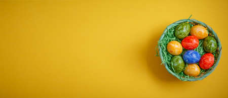 Banner for easter card. Flat lay composition with Easter eggs on yellow background. Top view