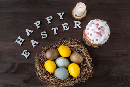 HAPPY EASTER greeting card Easter eggs. Happy Day Bright Easter. Orthodox Easter holiday. Traditional food. Creative stylish trend Homemade easter cake.