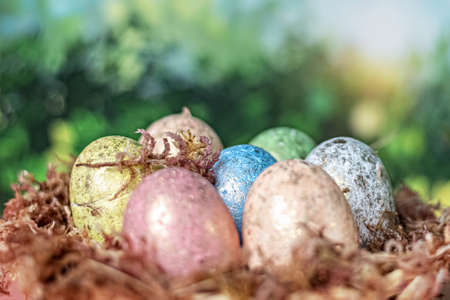 Top view of colored quail eggs placed near shiny symbol of Easter celebration on colorful background