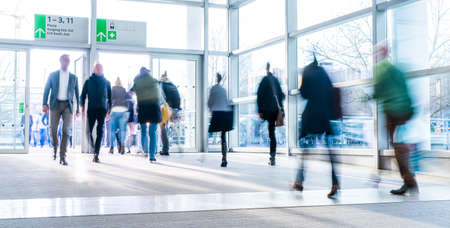 blurred people at a trade fair hall