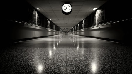 A long corridor extends into darkness, with a clock casting a shadow on the floor, marking the passage of time in silence.