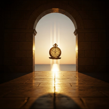 Vintage pocket watch in a doorway at sunset. 3D rendering