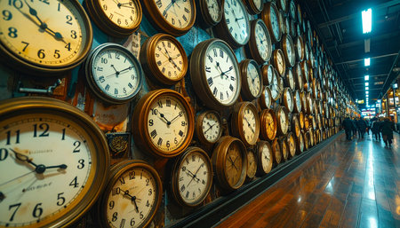 An angled perspective shot captures a vast wall adorned with countless vintage and antique clocks.