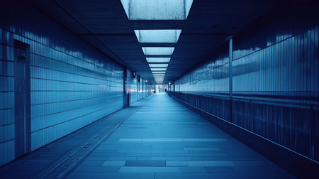 A captivating view of a futuristic underground subway tunnel featuring striking blue neon lights, symmetrical lines, and an empty path that creates a sense of depth and tranquility.