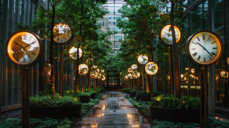 A tranquil urban garden featuring artistic clock installations amidst lush greenery. The modern architectural space offers a unique blend of nature and design, creating a serene ambiance.