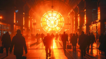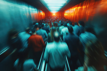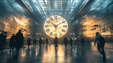 Busy Urban Scene with Blurred Crowd and Clock Symbol Representing Time Passing in a Modern City Environment