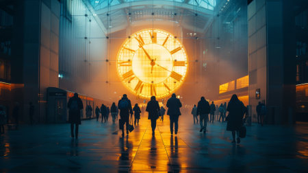 Blurred silhouettes of people move in front of a glass wall. The scene is dominated by warm tones with soft lighting. A clock hangs on the wall, indicating time. This image could be used for various commercial projects related to business, time management, or office environments.