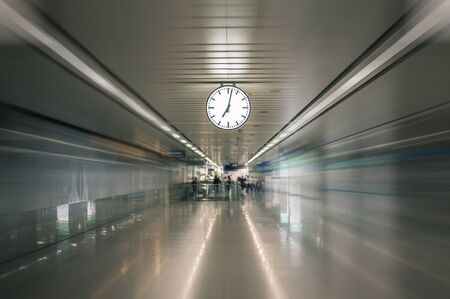 A Long exposure of busy airport terminal with motion blur of travelers, creating dynamic and bustling atmosphere
