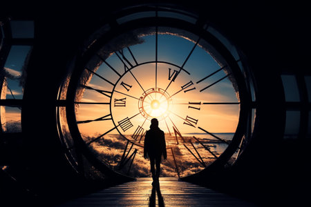 Man walking amidst ticking clocks, depicting aging and the relentless passage of time