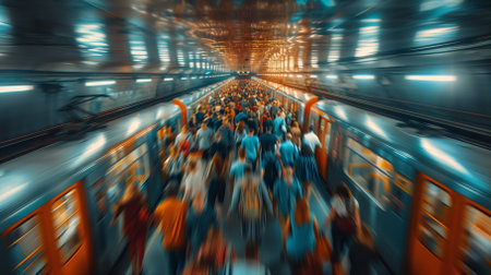 A bustling subway station platform filled with people waiting and boarding trains, showcasing urban life in motion
