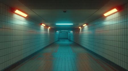 Empty underground pedestrian tunnel with tiled walls and ceiling, fluorescent lights creating vanishing point perspective in urban subway passage.