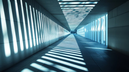A modern architectural hallway flooded with natural light, creating charming interplay of shadows and highlights, minimalist design of rhythmic patterns of light and shadow on the floor and walls