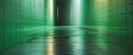AI Generated. Bright Green Tiled Corridor with Reflective Wet Floor