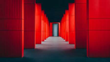 A high-tech neon light tunnel in bold red and white tones, appearing as a portal against a black void