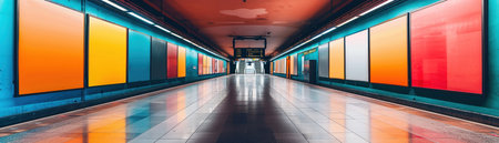 A long corridor in a contemporary subway station is illuminated with bright colors. The walls are decorated in shades of yellow blue red and green creating a cheerful atmosphere. The clean polished floor reflects the vibrant hues guiding commuters through the space