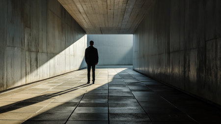 A solitary figure walks towards the light at the end of a concrete tunnel, the sunlight creating a dramatic and hopeful silhouette.