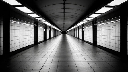 A striking monochrome photo of an underground passageway featuring clean tiles and bright lights, creating an atmosphere of solitude and modern design.