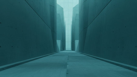 presents a striking architectural scene featuring a long, imposing corridor formed by massive, smooth concrete walls. The walls are geometrically shaped, creating a sense of scale and grandeur. The perspective draws the viewer down the pathway towards a bright, ethereal light at the vanishing point. The dominant color palette consists of cool teal and blue-green tones, contributing to a futuristic and serene atmosphere. The clean lines and minimalist emphasize the abstract and monumental...