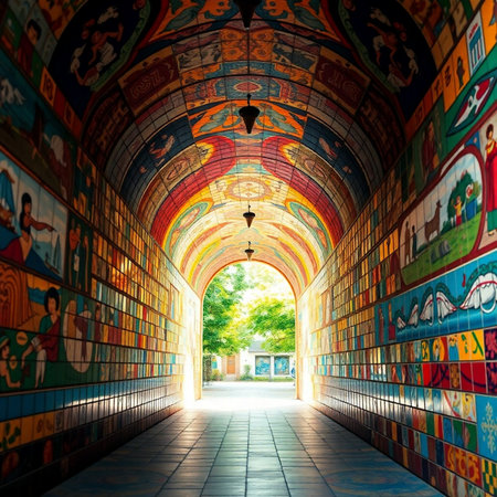 A close-up of a pedestrian tunnel with colorful murals or artwork on the walls, capturing the vibrant and creative design elements of the tunnel interior.