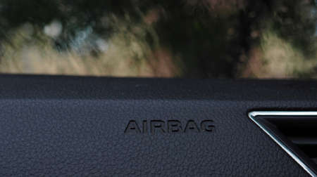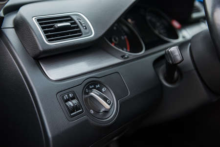 Interior of common European passenger car. Part of steering wheel, radio, dashboard and ventilation