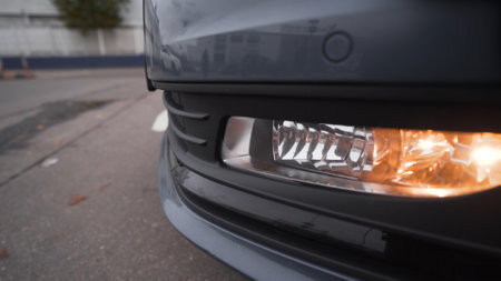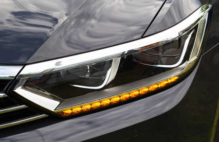 Close-up of headlights of modern car model. Action. Daytime running lights of new car. Beautiful front lights of new car in cloudy weather