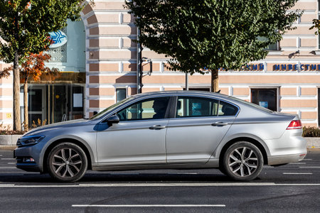 Moscow, Russia - October 13, 2021: silver Volkswagen Passat is parked on the street on a warm autumn day against the backdrop of a building and trees