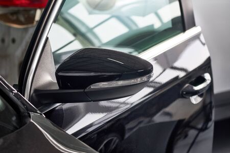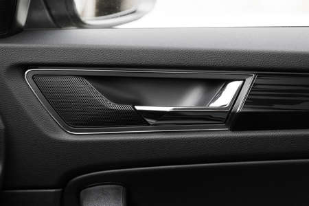 Side view of black executive luxury mini van car parked on the empty street focus in the door hande