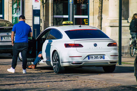 Reims France November 14, 2020 View of a traditional taxi for passengers rolling in the historical streets of Reims, a city in the Grand Est region of France and one of the oldest in Europe