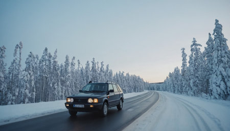 A vintage SUV drives along a wet, dark road cutting through a dense forest of snow-laden pine trees under a pale winter sky.