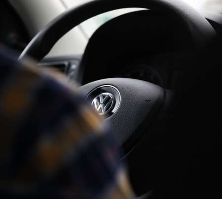 Barcelona, Spain - March 06, 2020: Volkswagen silver logo at steering wheel close-up