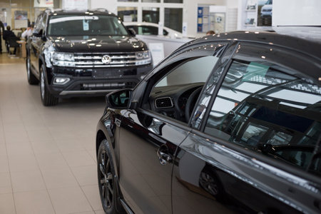 Russia, Izhevsk - February 15, 2019: Showroom Volkswagen. New cars in dealer showroom. Modern transportation.