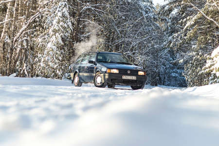 Minsk. Belarus. 06 February 2021. A retro blue car is parked in the snow. Bad weather,