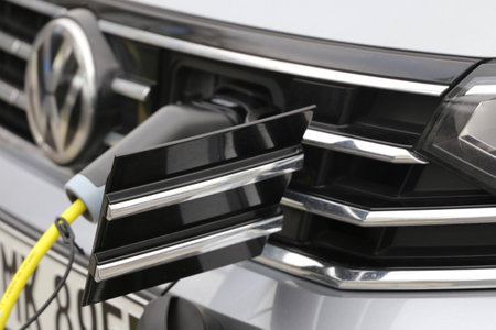 Wolfsburg, Germany - June 19, 2016: Volkswagen VW e-Golf electric car on the city streets. Volkswagen is a German car manufacturer headquartered in Wolfsburg, Germany.