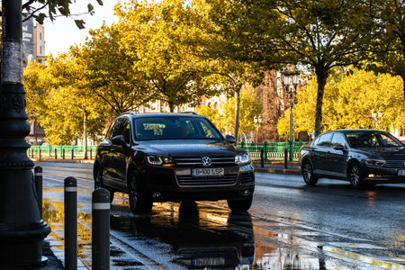 Car traffic at rush hour in downtown area of the city. Car pollution, traffic jam in the morning and evening in the capital city of Bucharest, Romania, 2020