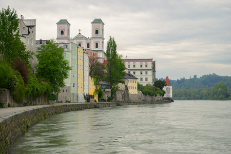 Passau, Germay - April 15, 2024: River Inn church and tower on a cloudy day in springtime