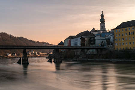 View atthe Red bridge over Inn river in Wasserburg am Inn town - Germany