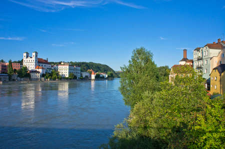 Confluence of rivers Inn, Danube and Ilz in Passau, Bavaria in Germany. The City of Three Rivers