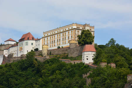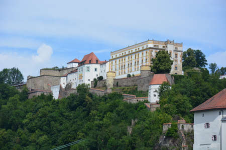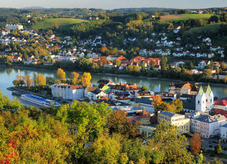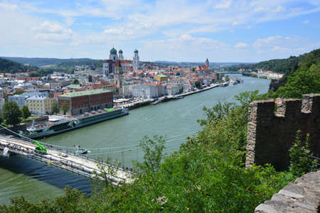 Panoramic view of Passau. Aerial skyline of old town from Veste Oberhaus castle . Confluence of three rivers Danube, Inn, Ilz, Bavaria, Germany.